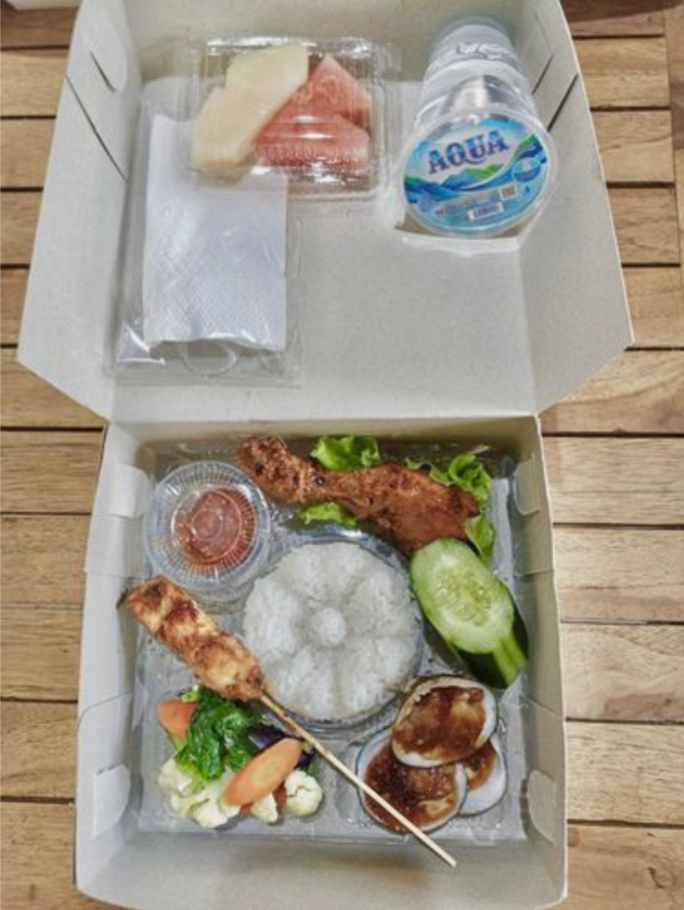 Nasi box dengan menu Spesial Bumbu Jimbaran yang berisi Nasi Putih, Ayam Bakar, Kerang Bakar Bumbu Jimbaran, Sate Ikan, Cap Cay/Plecing Kangkung, Lalapan (Selada, Timun dan Tomat), Sambal, Buah Potong dan Air Mineral dalam gelas.
