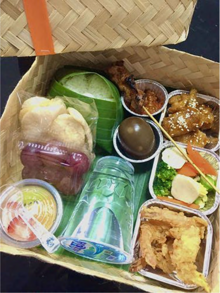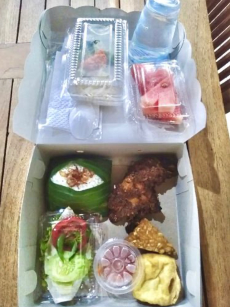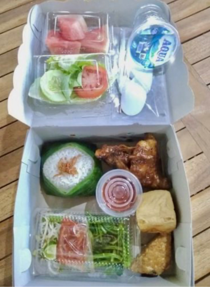 Nasi box dengan menu Lalapan yang berisi Nasi Putih/Nasi Uduk, Ayam Goreng/Ayam Bakar, Tempe Goreng, Tahu Goreng, Plecing Kangkung, Lalapan (Selada, Timun dan Tomat), Sambal, Buah PotongĀ dan Air Mineral dalamĀ gelas.