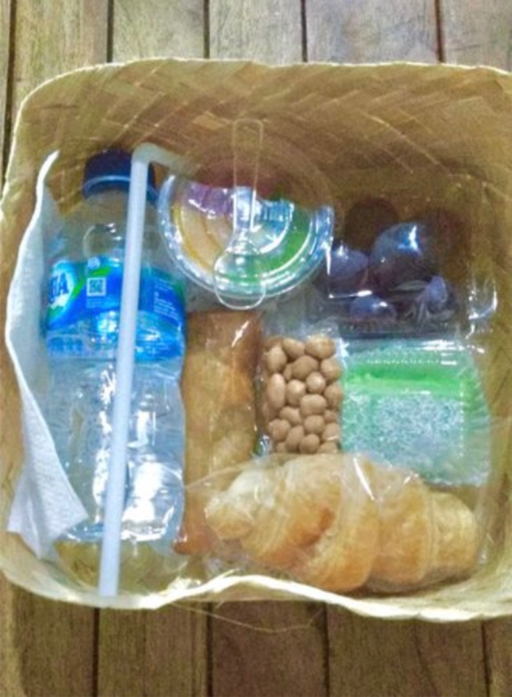 Snack Box menggunakan Besek VVIP dengan snack yang berisi Croissant, Cake Pandan, Lumpia, Pudding Buah, Kacang dan Air Mineral 330ml.