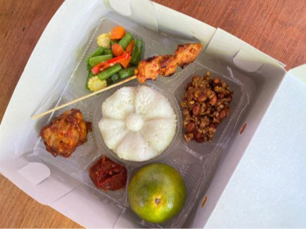 Snack Box berisi 4 Macam Snack (Danish Blueberry, Kue Ku, Lemper, dan Pudding Buah), Air Mineral 330ml, dan Kacang.